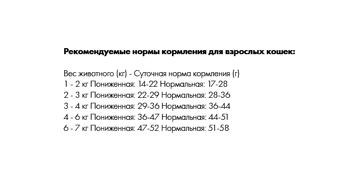 сырой протеин 35,0%, сырой жир 12,0%, сырая клетчатка 2%, сырая зола 7,5 %, углеводы 37,5%, кальций 1,4%, фосфор 1,1%, натрий 0,2%, калий 0,6%, омега-3 жирные кислоты 0,25%, омега-6 жирные кислоты 2,7%, влага 7,0%.