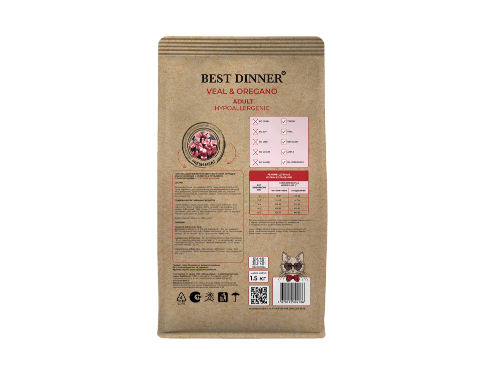 Специальные добавки (на 1 кг): Орегано - 2600 мг/кг, таурин - 1500 мг/кг, глюкозамин - 550 мг/кг, хондроитин - 270 мг/кг, юкка Шидигера - 500 мг/кг