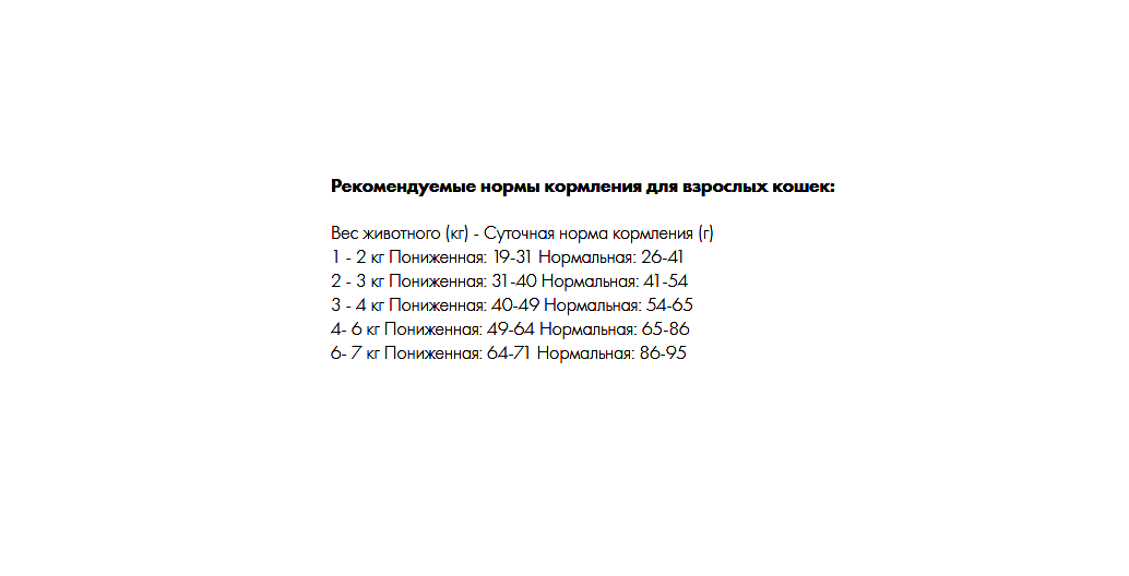 Сырой протеин 35,0%, сырой жир 17,0%, сырая клетчатка 2,4%, сырая зола 8,0 %, углеводы 30%, кальций 1,4%, фосфор 1,1%, натрий 0,3%, калий 0,6%, лизин 1,7%, метионин + цистин 1,2%, триптофан 0,2%, омега-3 жирные кислоты 0,25%, омега-6 жирные кислоты 2,7%, Влага не более 7,0%.