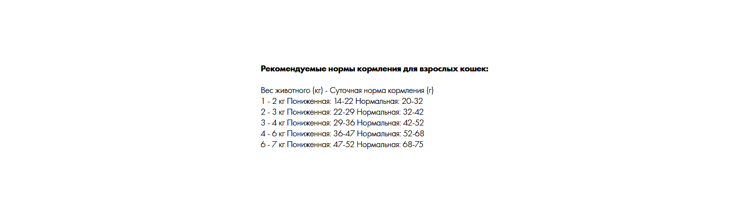 Сырой протеин 35,0%, сырой жир 12,0%, сырая клетчатка 2,4%, сырая зола 8,0 %, углеводы 35%, кальций 1,4%, фосфор 1,1%, натрий 0,3%, калий 0,6%, лизин 1,7%, метионин + цистин 1,2%, триптофан 0,2%, омега-3 жирные кислоты 0,25%, омега-6 жирные кислоты 2,7%, влага не более 7,0%.