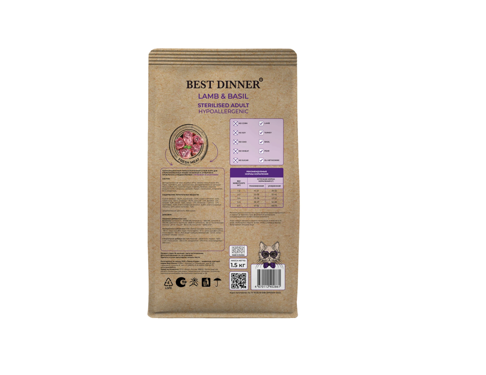 Спец. добавки (на 1 кг): Базилик – 3500 мг/кг, таурин - 1500 мг/кг, глюкозамин - 550 мг/кг, хондроитин - 270 мг/кг, юкка Шидигера - 500 мг/кг.