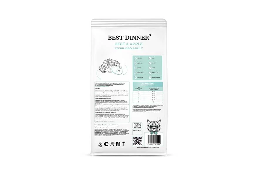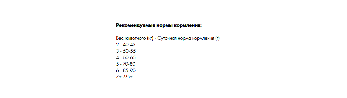 сырой протеин 31%, сырой жир 12,0%, сырая зола 6,5%, сырая клетчатка 3,5%, углеводы 39,0%, омега-3 жирные кислоты 0,26%, омега-6 жирные кислоты 2,40%, влага 8,0%.