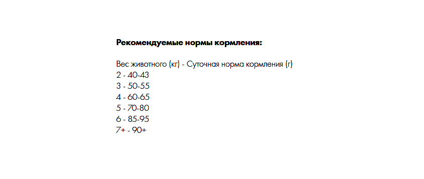 сырой протеин 30%, сырой жир 12,0%, сырая зола 6,2%, сырая клетчатка 3,0%, углеводы 40,8%, омега-3 жирные кислоты 0,26%, омега-6 жирные кислоты 2,51%, влага 8,0%.
