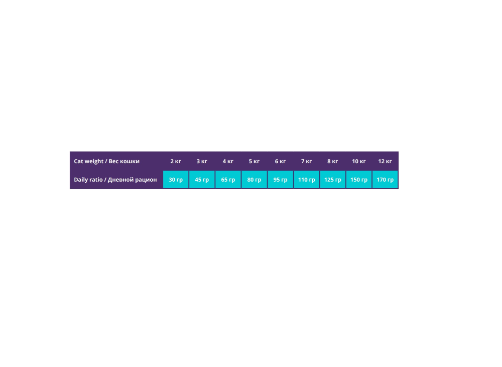 Аналитический состав: сырой белок 32%, сырые масла и жиры 14%, сырая клетчатка 2,4%, зола 7,4%, влага 8%, кальций 1,10%, фосфор 0,95%, магний 0,10%, омега-3 жирные кислоты 0,45%, омега-6-жирные кислоты 2,2%