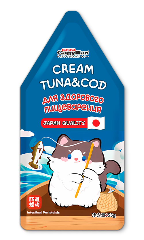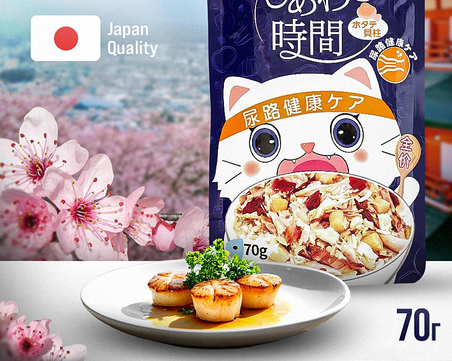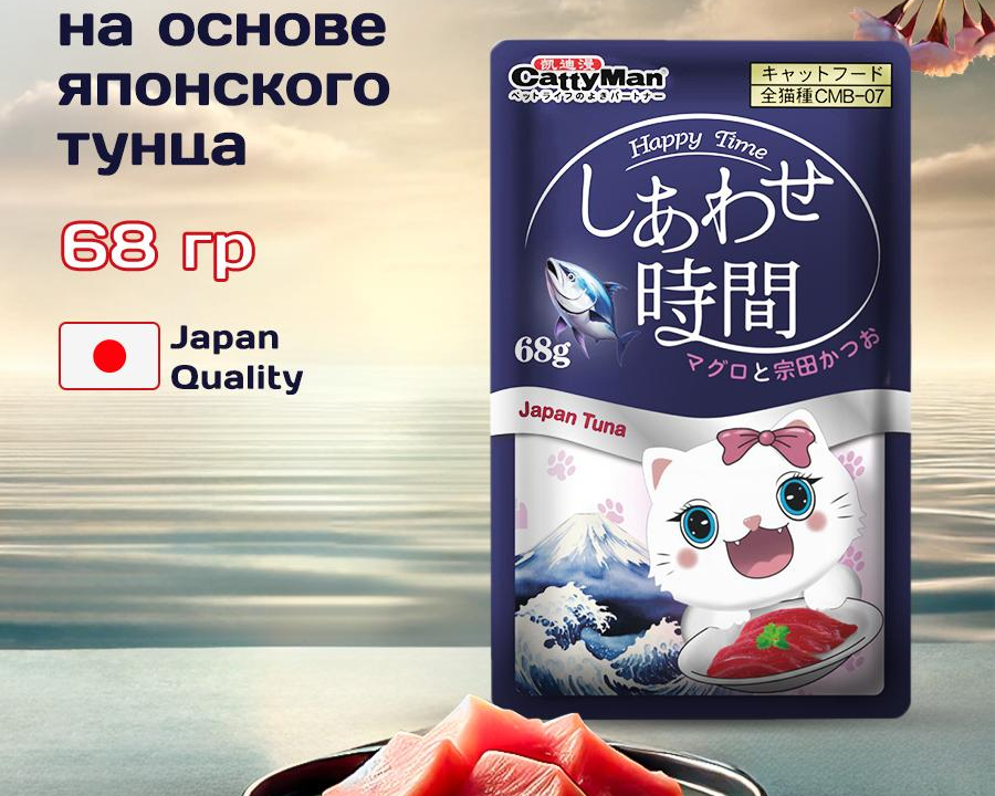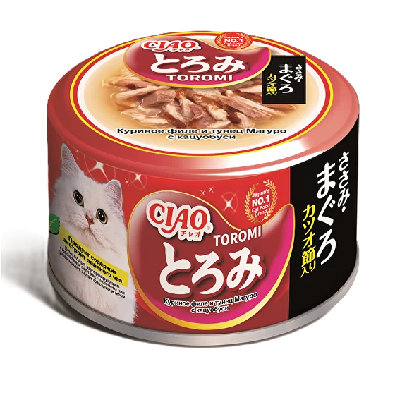 Состав: Тихоокеанский тунец, японский тунец бонито, креветки, экстракт гребешка, тапиока, полифенолы японского чая, рыбий жир (из японского тунца), порошок юкки, витамин Е, таурин, фруктоолигосахарид, хлорид кальция, трикальцийфосфат, натуральный краситель, бифидобактерии, лактобактерии.