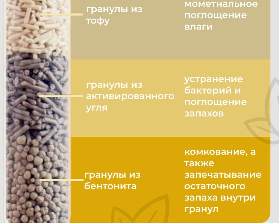 Гранулы из тофу (соевый жмых), которые отвечают за моментальное поглощение влаги.