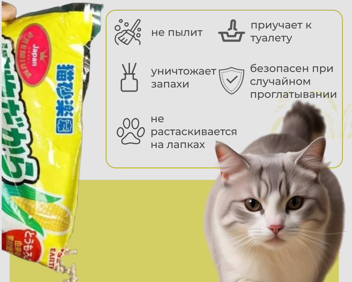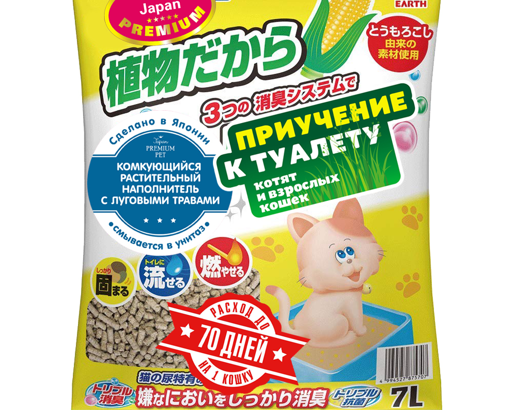 Растительный наполнитель на основе кукурузы быстро впитывает влагу и неприятные запахи.